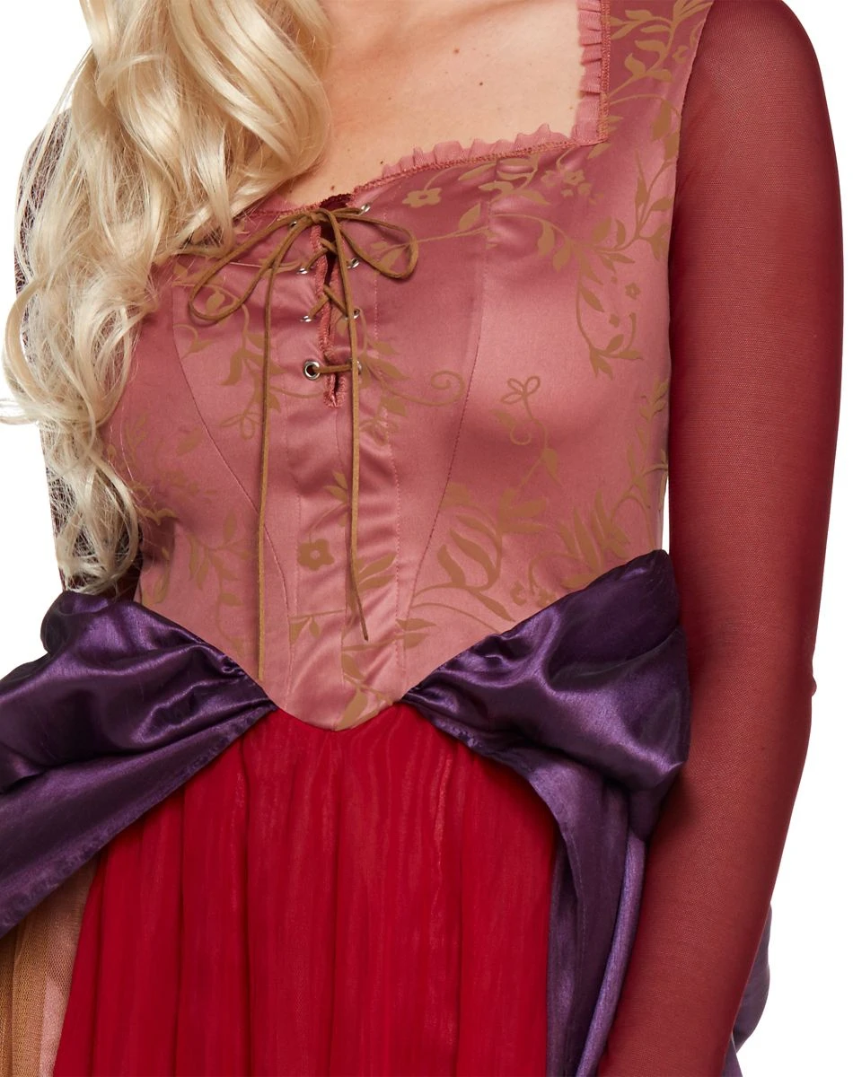 Cause trouble with your sisters and put the neighborhood children under a sleepy spell when you dress up as the famous Sarah Sanderson! Join Winifred and Mary as you dance around in Sarah’s signature dress. This captivating plus size style is designed with a sexy lace-up bodice, layers of contrasting pink hues for a feminine touch and a lustrous skirt that flows out into beautiful red and purple layers. Any die-hard Hocus Pocus fan will be jealous of your spellbinding style this Halloween!
